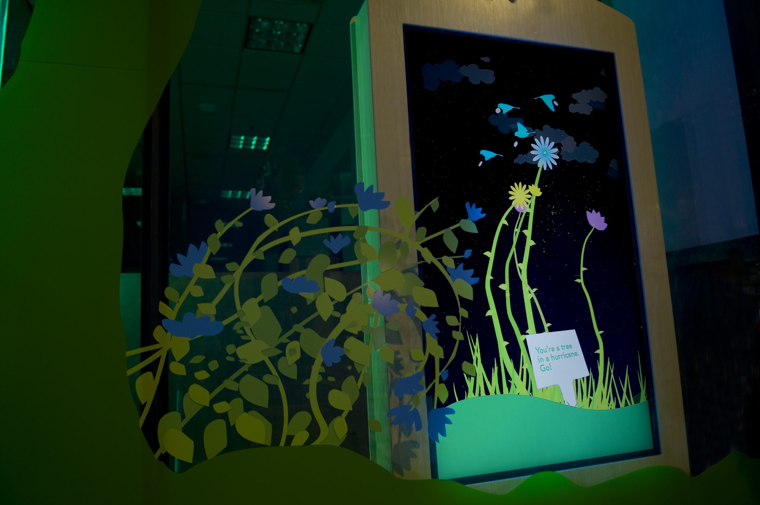 We developed custom software using openFrameworks (openframeworks.cc), an open source development environment for C++. The software is displayed on an HD (1080 x 1920) vertical LCD screen, enclosed in a custom fabricated bamboo frame. As the user stands in front of the display, a camera captures them and the software analyzes the movement in each frame of the video. In realtime, the user’s movement is translated in to a wind force. This force and the accompanying physics system animates bring the environment to life. As the user sways and moves, the plants move with them. The interaction becomes a tango between the user and the plants. We are isolating the upward motion and computing that into plant growth to encourage growth. The more someone moves up the more the plants will grow. The application has two modes: day and night. At night the sky fades to a black gradient and stars twinkle in the background. When the sun rises the environment transitions back into a sunny day.