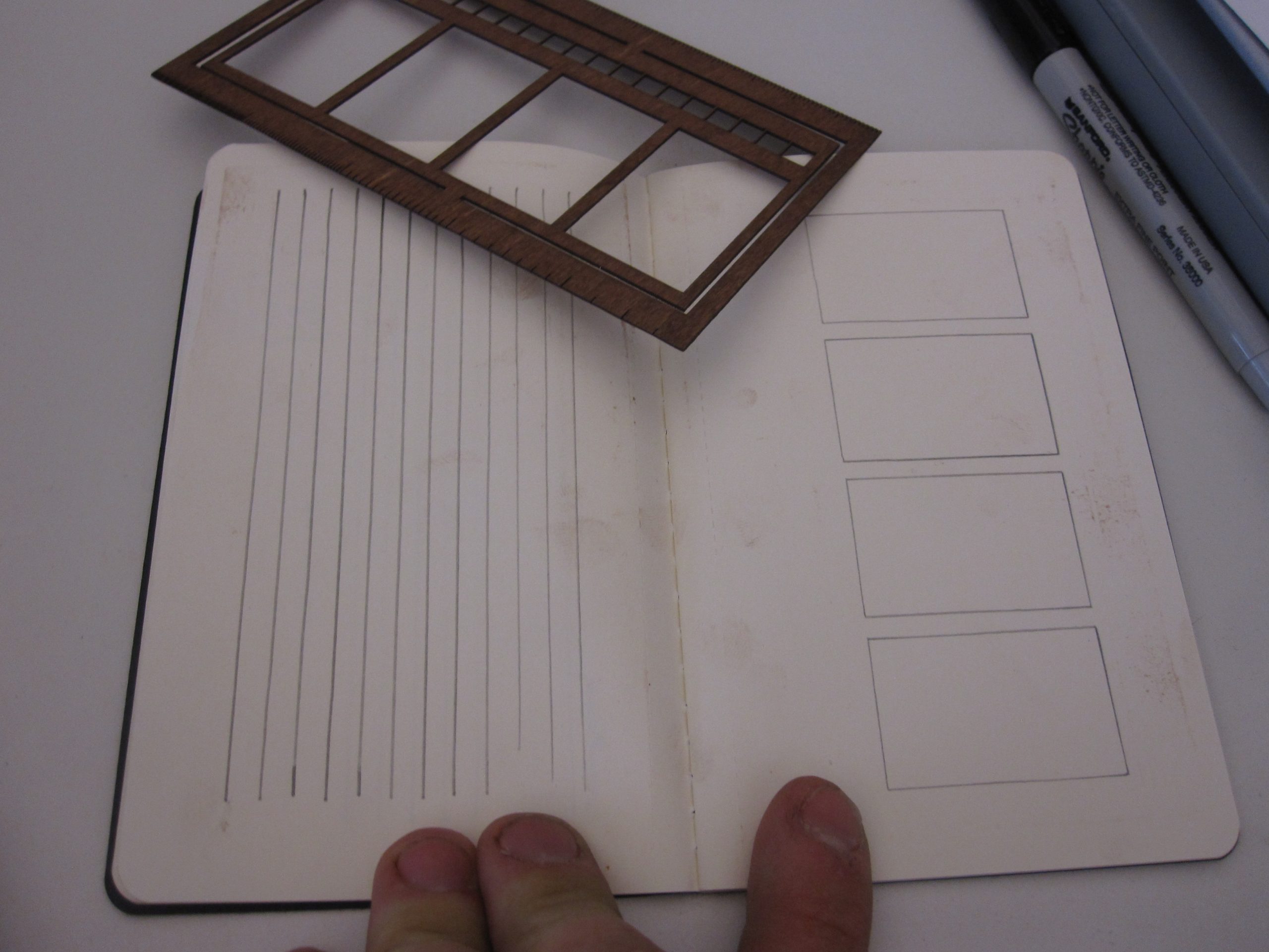 We all like Moleskins, right? Its a full experience, from the store shelf to your book shelf. Writing on the first page, or choosing to not write on the first page, choosing which way you want to orient it to draw your next idea and what to put in that awesome little pocket in the back. It’s great! But I have one complaint. The first choice you have to make in the moleskin process is which book suits you best. Are you a plain, graphed, lined, or story board person? Well Moleskin, I need all those things! I make things, and when you make things you write, draw, plan and sometimes graph things. The ultimate moleskin would have alternating pages with plain, lined and graph paper. Allowing you to sketch, take notes and refine your thoughts. So in the meantime, I made this ruler. It is designed to fit in your notebook and allow you to customize your page layouts. So people enjoy the freedom of the bank paper but sometimes it nice to have a little organization. I’m hoping to make a couple 100 soon so please email me if you would like one. I don’t know how much they will be yet but please let me know if you’re interested. I won’t hold you to it.